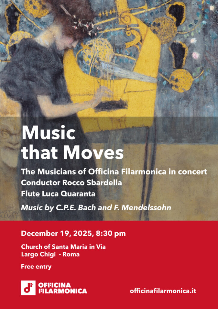 Friday, December 19th, 2025, at 8:30 PM, the Musicians of Officina Filarmonica will perform in the historic Church of Santa Maria in Via, at Largo Chigi, in the center of Rome — with a concert entitled “Music that Moves”.