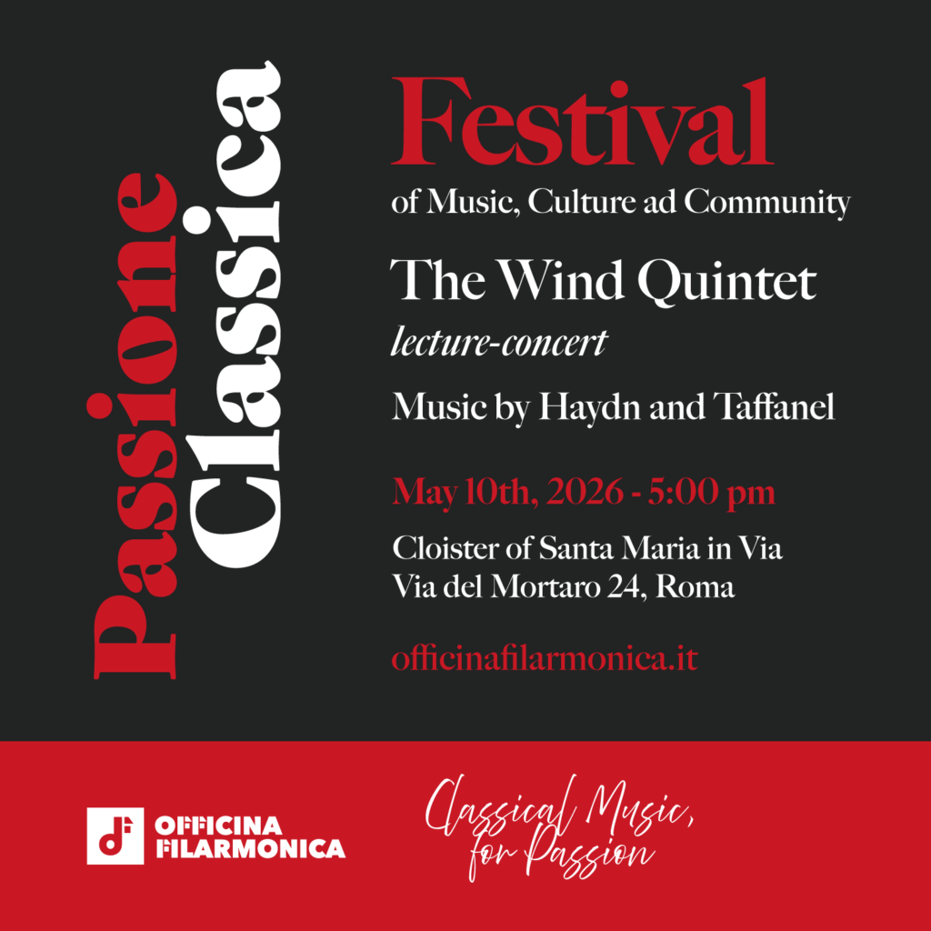 “Passione Classica – Festival of Music, Culture and Community” is an event by Officina Filarmonica dedicated to classical music, taking place from May 10th to 24th, 2026 in Rome, at the Cloister of Santa Maria in Via, in the heart of ancient Rome.